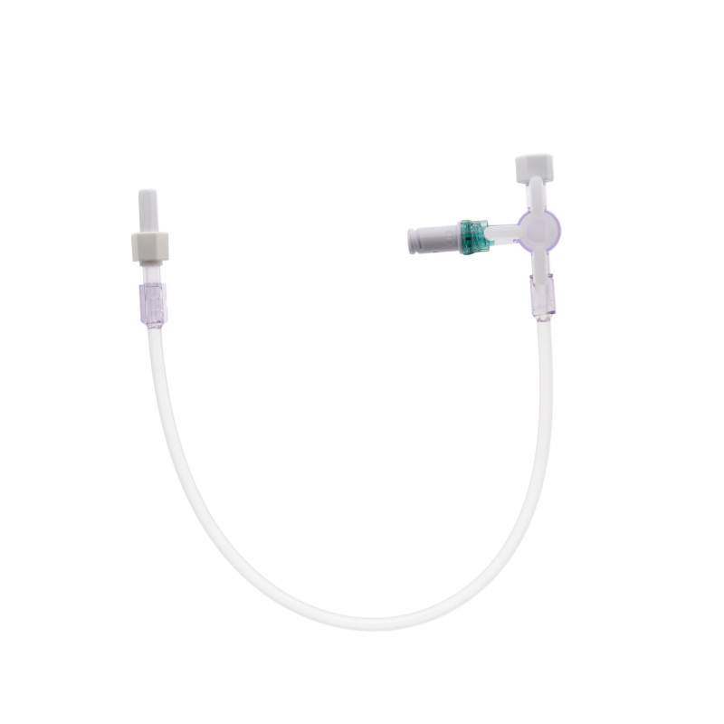 Triple layer extension tube (PVC/VYG2/PE) with lipid resistant three-way stopcock and Bionector on the lateral port of the stopcock (5141.01/00/10) or with two Bionector on each female port of the stopcock (5141.011/001).