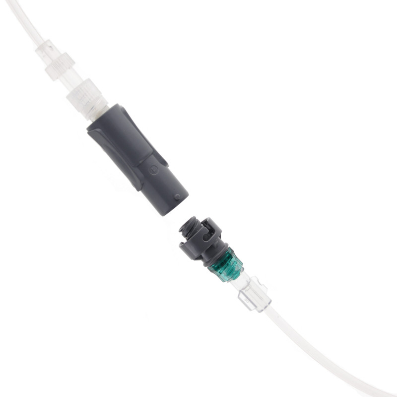 When a Qimomale or a male Luer end is connected onto Qimofemale, the membrane in polyisoprene moves thanks to a metallic spring and opens an internal conduit allowing the injection, infusion, sampling.