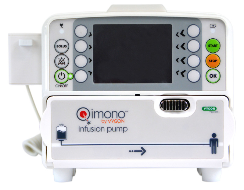 Continuous linear peristaltic perfusion pump for administration of cytotoxic and hazardous drugs in day care hospital.Can only be used with Qimo IV Set code 7229.xxx infusion lines